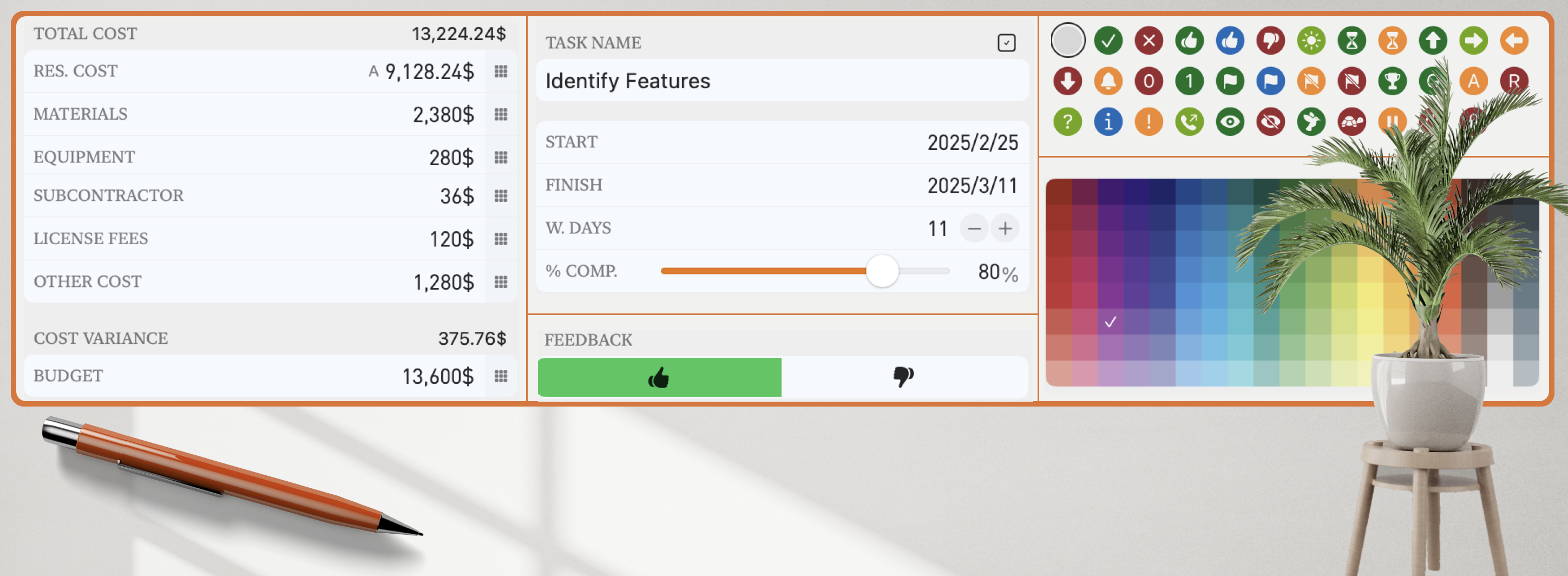 QuickPlanX offers extensive customization to fit your unique project management style. Configure project-level settings including start/end dates, resources, and link types. Customize fields to capture the exact information you need. Fine-tune the display of taskbars in Gantt charts, elements in Tree and Columns views, and personalize the UI to create your ideal workspace.